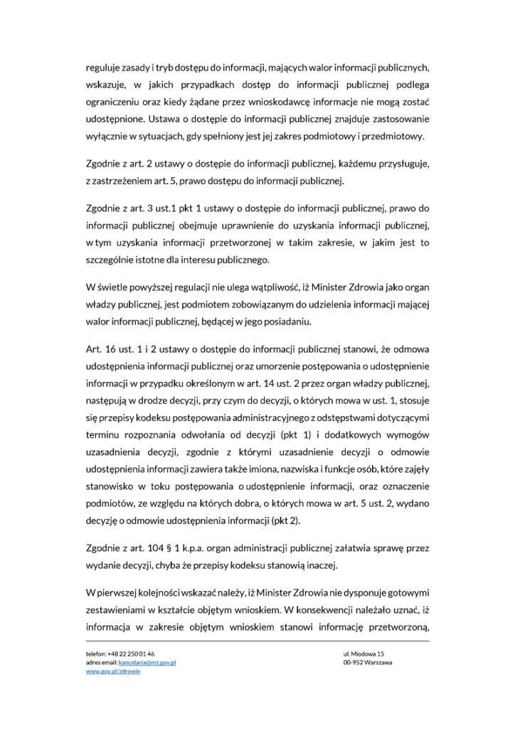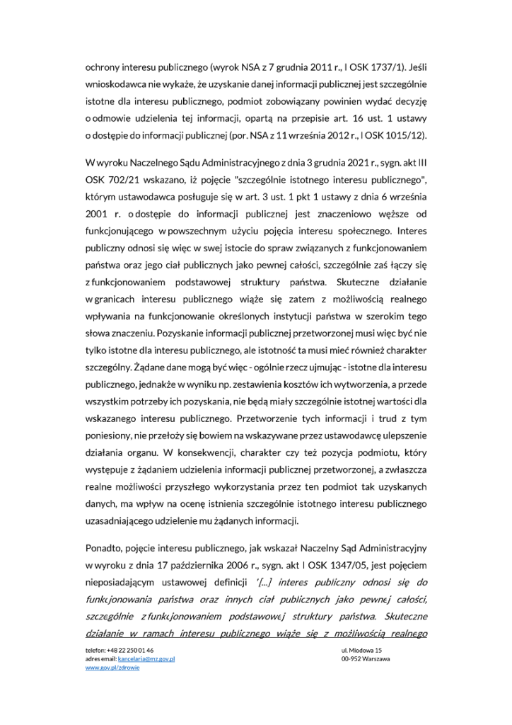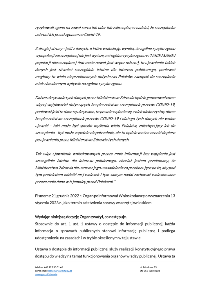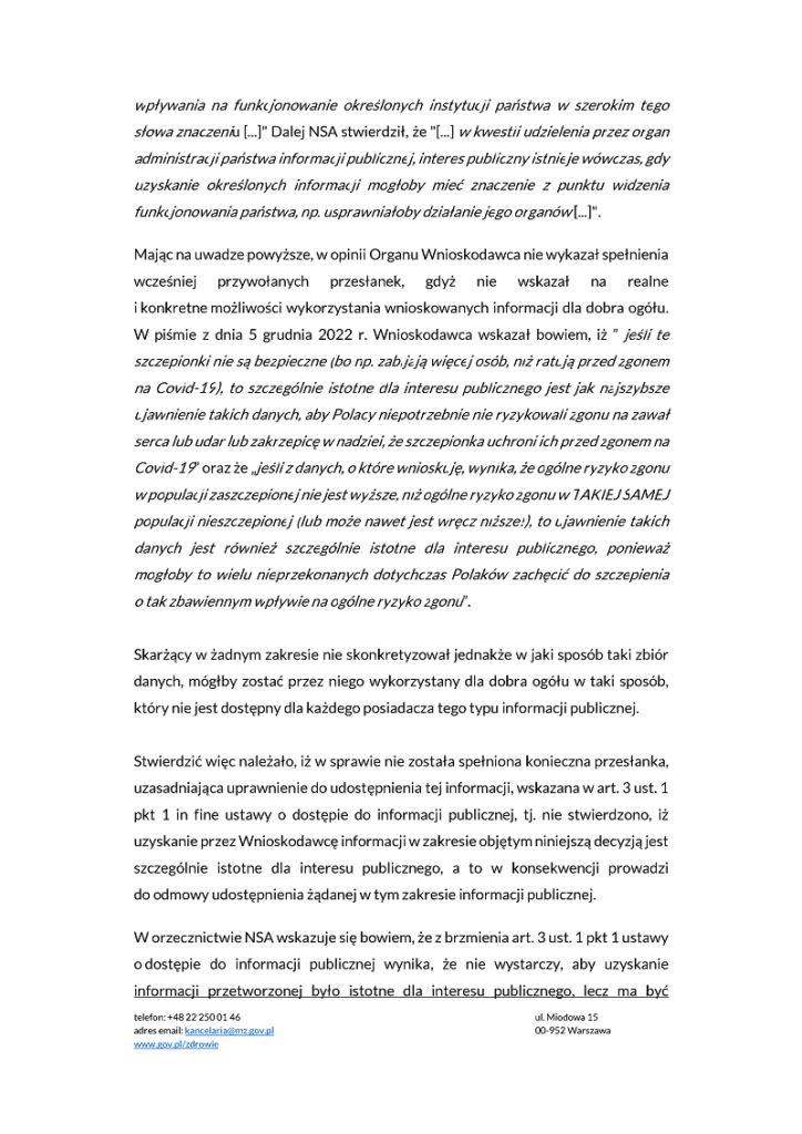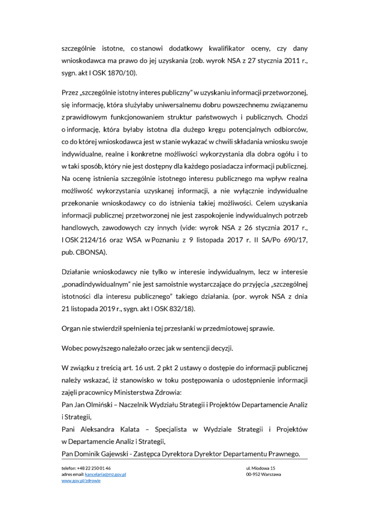 Tak więc ujawnienie wnioskowanych przeze mnie informacji bez wątpienia jest szczególnie istotne dla interesu publicznego, chociaż jestem przekonany, że Ministerstwo Zdrowia nie uzna mojego uzasadnienia za przekonujące po to, aby pod tym pretekstem oddalić mój wniosek i tym samym nadal zachować wnioskowane przeze mnie dane w tajemnicy przed Polakami.”