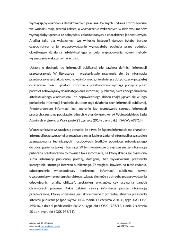 informacja w zakresie objętym wnioskiem stanowi informację przetworzoną, wymagającą wykonania dedykowanych prac analitycznych. Pytania sformułowane we wniosku mają szeroki zakres, a wyznaczenie wskazanych w nich wolumenów wymagałoby łączenia ze sobą wielu zbiorów danych o charakterze jednostkowym. Analiza taka dla wskazanych we wniosku kategorii danych byłaby bardzo czasochłonna, a jej przeprowadzenie wymagałoby podjęcia przez podmiot określonego działania intelektualnego w celu wypracowania nowej metody wyznaczenia wskazanych wartości.”