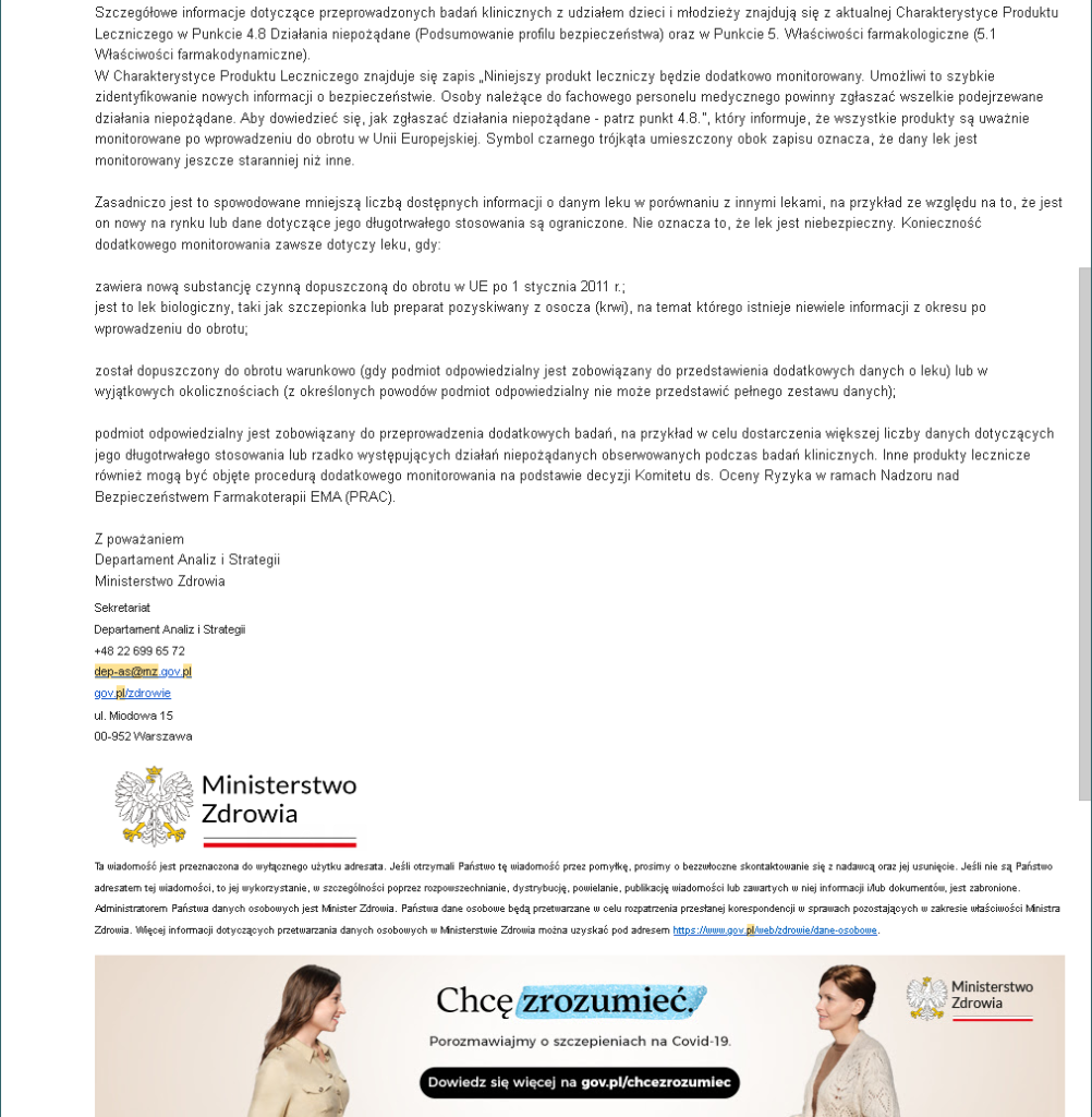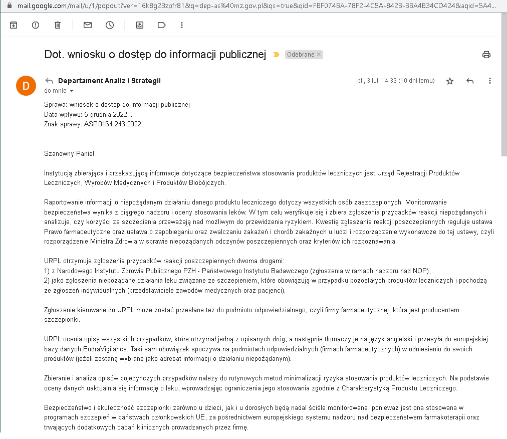 Tak więc uzyskanie wnioskowanej przeze mnie informacji jest bez wątpienia i wbrew twierdzeniom Organu szczególnie istotne dla interesu publicznego bez względu na to, czy z wnioskowanych informacji wynika, że te szczepionki są nieskuteczne i/lub niebezpieczne, lub tym bardziej, że są skuteczne i bezpieczne.