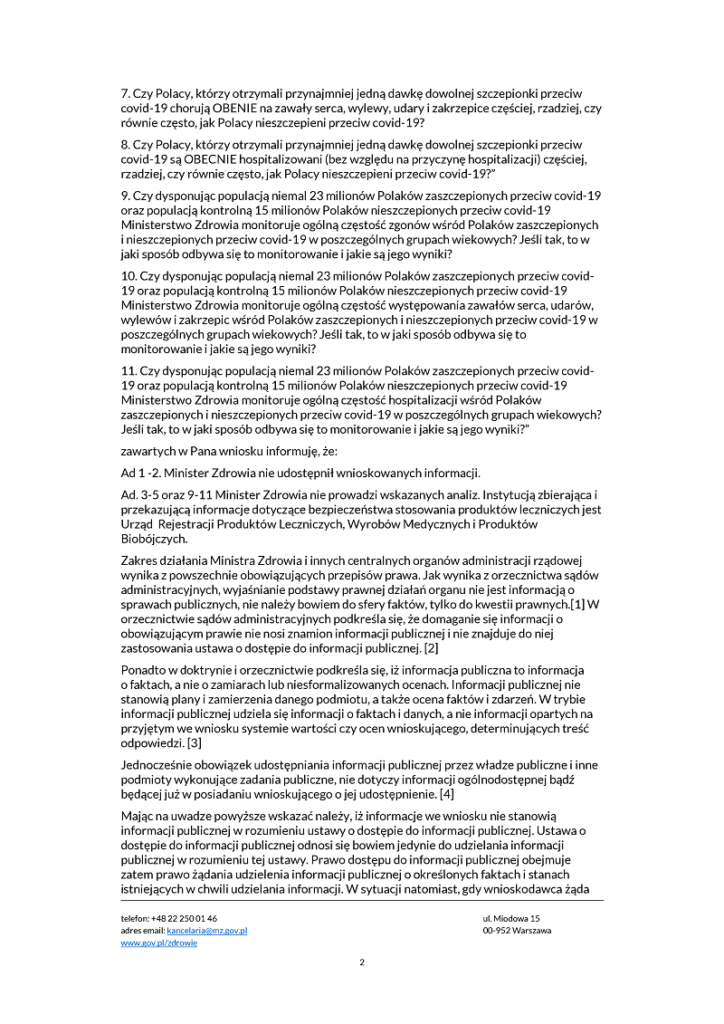 Poza tym odmowa udostępnienia wnioskowanych danych dodatkowo wzbudza nieufność wobec tych szczepień, ponieważ jeśli Minister Zdrowia nie chce ujawnić danych, na podstawie których można ocenić bezpieczeństwo tych szczepionek, to być może są one niebezpieczne dla zdrowia i dlatego Minister Zdrowia nie chce ujawnić tych danych, jednocześnie chętnie ujawniając w praktyce bezwartościowe dane o zgonach “na COVID-19”.