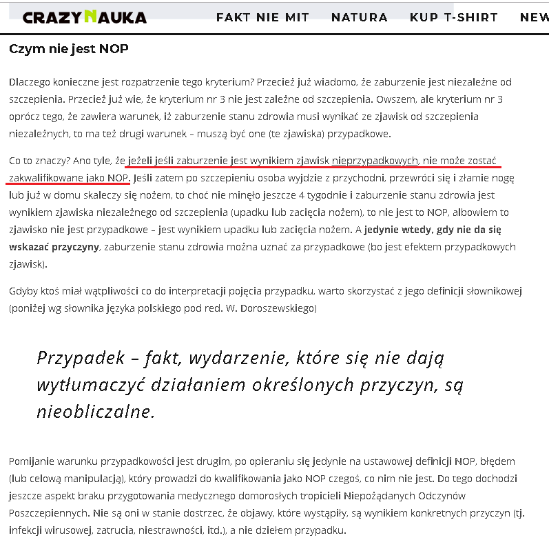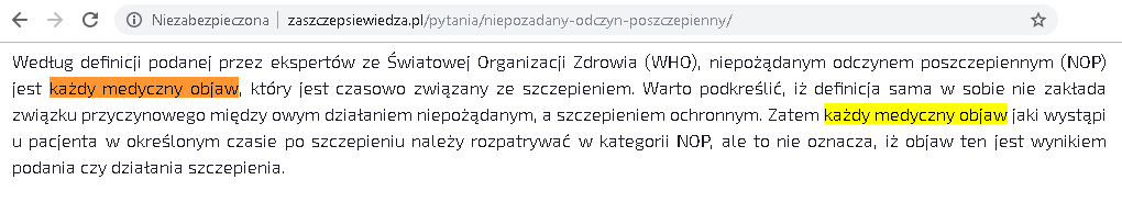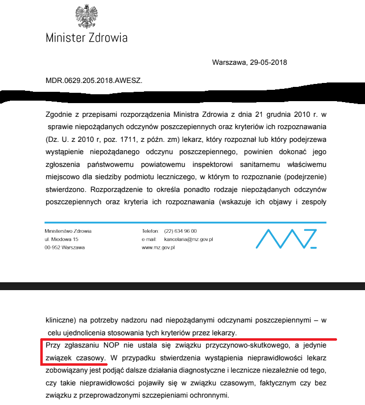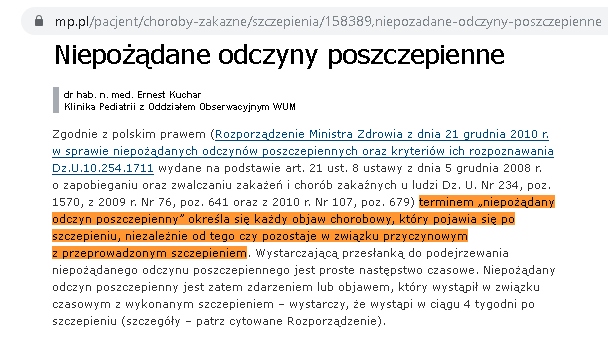 Aby mieć pewność, że krajowy konsultant w dziedzinie epidemiologii nie kłamie, celowo próbując wprowadzać opinię publiczną, a zwłaszcza lekarzy, w błąd, wnoszę o udostępnienie mi tej definicji, zgodnie z którą zgłoszeniu jako NOP podlega każde zaburzenie stanu zdrowia „MOGĄCE MIEĆ ZWIĄZEK ZE SZCZEPIENIEM”. Ta nieznana mi definicja musi przecież istnieć, skoro Pani Doktor Paradowska-Stankiewicz się na nią powołuje. No chyba że Pani Doktor kłamie lub może po prostu nie do końca rozumie tematykę, którą chciała przybliżyć, nie ogarniając mentalnie elementarnej różnicy między związkiem czasowym, a przyczynowo-skutkowym.