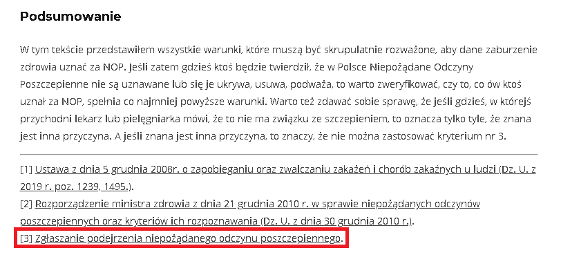 Wnoszę również o wskazanie podstawy prawnej dla twierdzenia głoszonego przez Panią Doktor Paradowską-Stankiewicz, jakoby lekarz podejmował decyzję o zasadności zgłoszenia danego przypadku do nadzoru jako NOP „kierując się listą NOP wymienioną w załączniku do Rozporządzenia Ministra Zdrowia w sprawie niepożądanych odczynów poszczepiennych oraz kryteriów ich rozpoznawania oraz prawdopodobną lub ustaloną etiologią rozpoznanych zaburzeń”. Więc który akt prawny nakazuje lekarzom brać pod uwagę kryteria inne, niż kryterium zbieżności czasowej ze szczepieniem? Wnoszę o wskazanie tego aktu prawnego – ponownie aby mieć pewność, że Pani Doktor Iwona Paradowska-Stankiewicz wie, o czym pisze i że nie wprowadza lekarzy w błąd, albowiem jedyna znana mi dotychczas definicja NOP stanowi, że niepożądany odczyn poszczepienny to niepożądany objaw chorobowy pozostający w związku czasowym ze szczepieniem. Jeśli są jakieś inne definicje, na bazie których krajowy konsultant w dziedzinie epidemiologii twierdzi to, co twierdzi, to naprawdę bardzo chętnie się z nimi zapoznam.