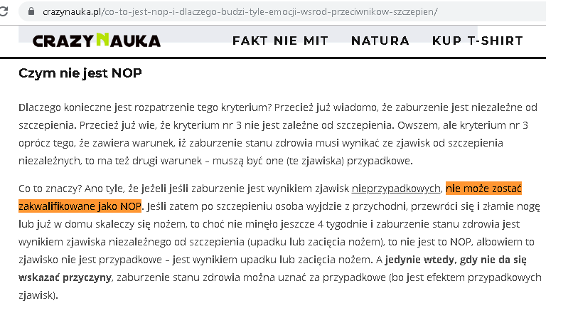 Pytam o to, ponieważ Pani Doktor wydaje się tutaj sugerować lekarzom, żeby nie zgłaszali NOP, gdy stwierdzają wystąpienie objawu chorobowego w następstwie czasowym szczepienia, ale jednocześnie nie dostrzegają „związku [przyczynowego] ze szczepieniem”. Potocznie takie zjawisko znane jest jako „To na pewno nie od szczepionki”.