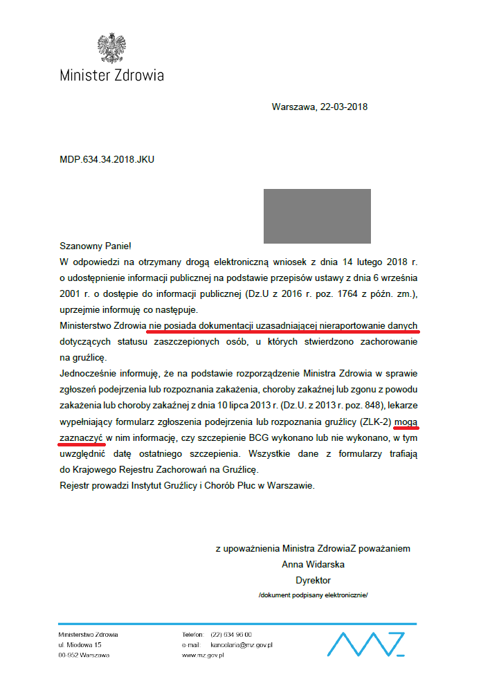Z nieznanych mi przyczyn uprawnione do tego organy nie gromadzą bardzo ważnych informacji, czy osoba chorująca na gruźlicę została zaszczepiona, kiedy została zaszczepiona i jaką szczepionką została zaszczepiona. Niniejszym wniosek ma na celu uzyskanie informacji o przyczynach rezygnacji z gromadzenia tak istotnych danych dotyczących skuteczności stosowanych szczepionek.