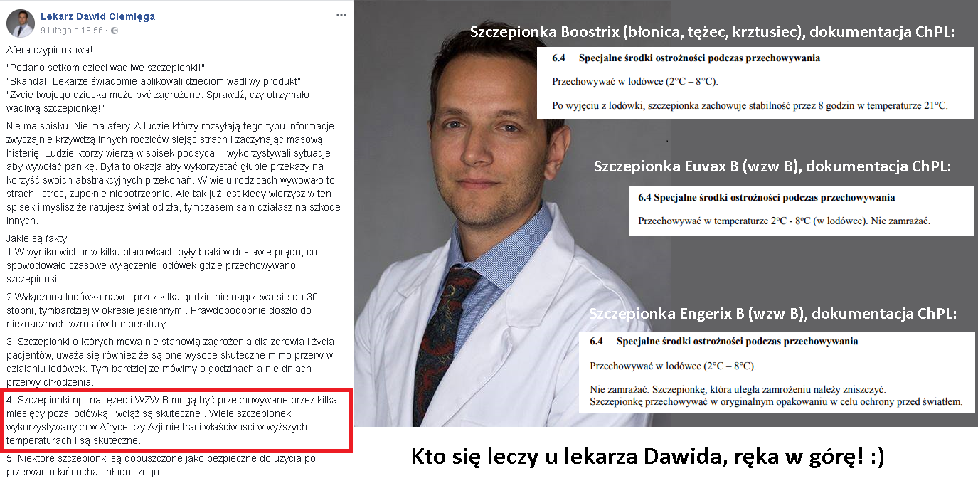 ps. Ten mój komentarz sobie oczywiście zapiszę, robiąc zrzut z ekranu tuż po jego opublikowaniu. Jeśli go Pan wykasuje, lub mnie zablokuje (wtedy jak wiadomo zniknie również ten komentarz), będzie to stanowiło oczywisty i bezpośredni dowód na to, że boi się Pan merytorycznej dyskusji o bezpieczeństwie szczepień. Proszę udowodnić, że jest Pan gotów do merytorycznej rozmowy o bezpieczeństwie szczepień bo ja miałbym w tej sprawie (i wyłącznie w tej) do Pana bardzo dużo pytań. A jeśli nie chce Pan o tym rozmawiać, to wtedy automatycznie niejako sam uzasadnia Pan podejrzenia, że tak naprawdę jednym z celów pańskiej działalności na FB polegającej na publikowaniu takich postów, jak niniejszy, jest nakręcanie „spirali hejtu” wokół Pana, co jak widać bardzo wymiernie i pozytywnie przekłada się na Pana popularność jako lekarza pediatry. No bo kto by nie chciał, aby jego dziecko leczył lekarz Dawid Ciemięga – „ten z telewizji”, prawda?