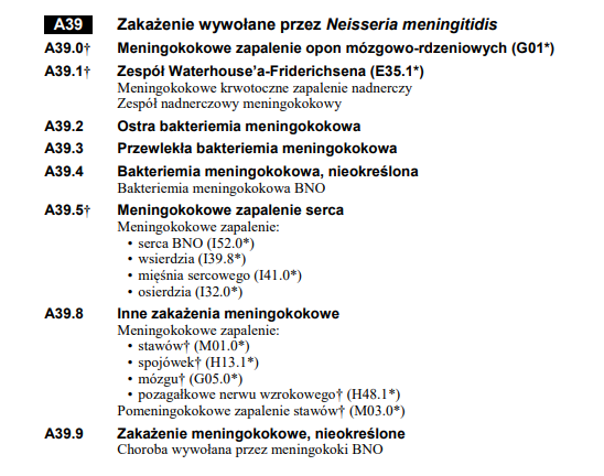 Meningokoki to kod A39 w Międzynarodowej Statystycznej Klasyfikacji Chorób i Problemów Zdrowotnych: