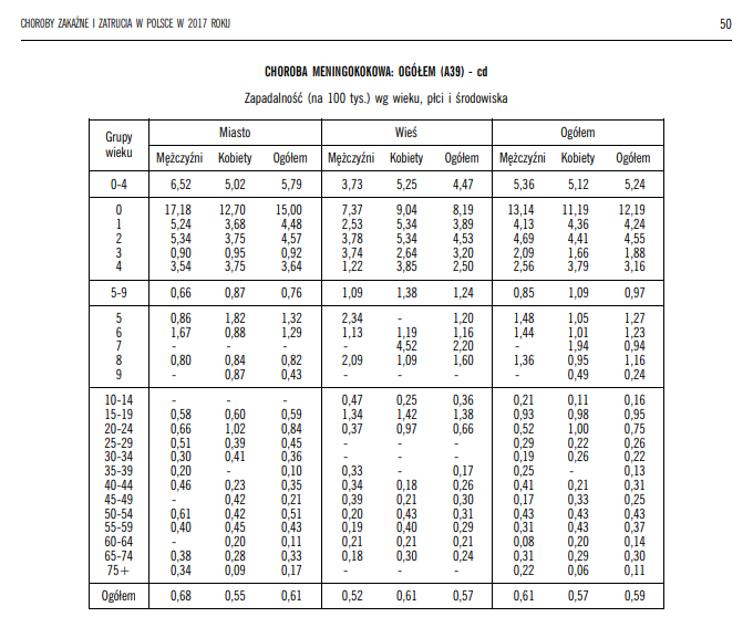 Zachorowalność na chorobę meningokokową na przykład w roku 2017 we wszystkich grupach wiekowych wyglądała tak: