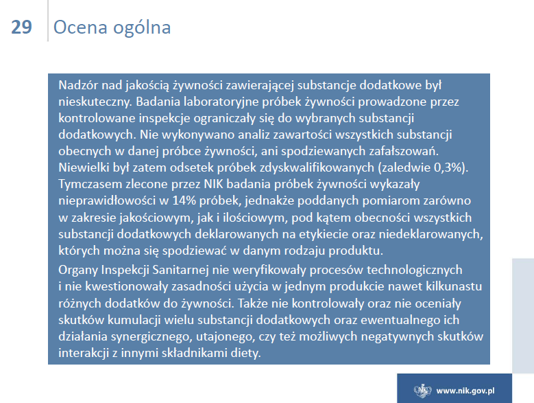 (Raport NIK „Nadzór nad stosowaniem dodatków do żywności, Lata 2016–2018 (I kwartał)”, strona 29)