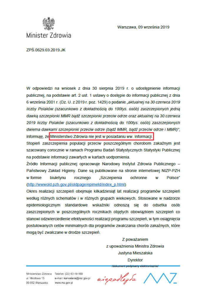 W swojej odpowiedzi Ministerstwo informuje, że nie jest w posiadaniu informacji, o którą pytam, czyli że nie wie, jaka jest aktualna na 30 czerwca 2019 liczba Polaków (choćby nawet szacunkowo, z dokładnością do 100tys. osób) zaszczepionych jedną dawką szczepionki MMR bądź szczepionki przeciw odrze oraz aktualna na 30 czerwca 2019 liczba Polaków (szacunkowo z dokładnością do 100tys. osób) zaszczepionych dwiema dawkami szczepionki przeciw odrze (bądź MMR, bądź przeciw odrze i MMR).
