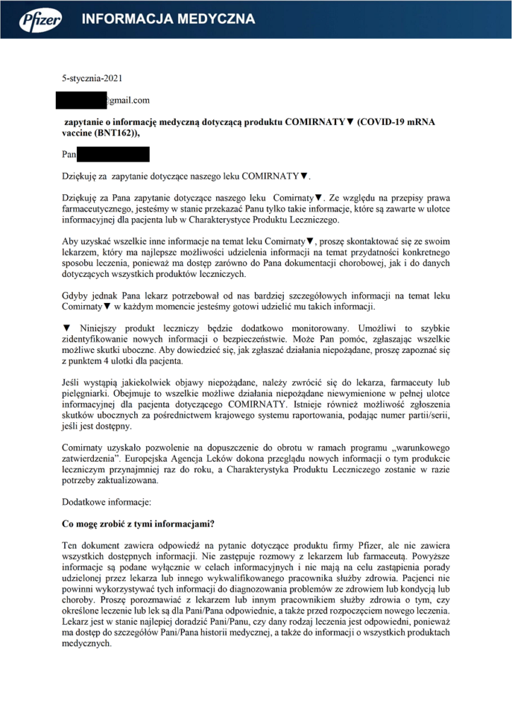 Takiego maila napisałem do Pfizera, aby się dowiedzieć, czy szczepionka COMIRNATY jest bezpieczna w moim przedziale wiekowym, czyli czy nie zabija więcej osób, niż chroni przed covidem.