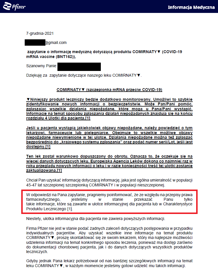 Wynika z tego, że pytanie, jaka jest ogólna umieralność w populacji 45-47 lat szczepionej szczepionką COMIRNATY i w populacji nieszczepionej, nie jest „pytaniem medycznym dotyczącym naszych produktów”…