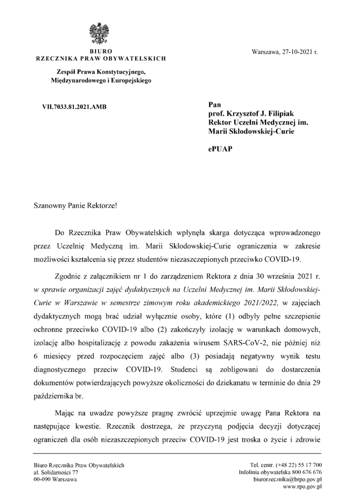 Po skierowaniu do Rzecznika Praw Obywatelskich zawiadomienia, że uczelnia medycznej im. MariiI Skłodowskiej-Curie w Warszawie odmawia możliwości uczestniczenia w zajęciach studentom nieszczepionym (o ile nie zrobią testu co 7 dni lub nie są oficjalnymi ozdrowieńcami), RPO tłumaczy rektorowi Filipiakowi, że zbłądził. 🙂