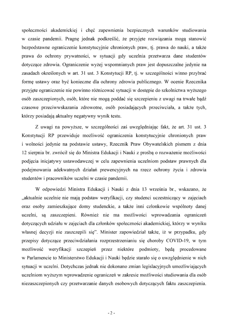 RPO tłumaczy rektorowi Filipiakowi (UW MSC), że nie wolno zabraniać nauki studentom nieszczepionym