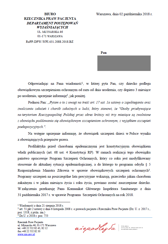 Jestem rodzicem, którego dziecko, jak wiadomo, podlega obowiązkowi tak zwanych „szczepień ochronnych”. Zwracam się więc od Pana Rzecznika Praw Pacjenta jako Urzędu w mojej ocenie najbardziej kompetentnego w zagadnieniu praw pacjenta, z pytaniami o prawa pacjenta, a konkretnie o prawo do informacji przed zabiegiem medycznym, jakim jest „szczepienie ochronne” w ramach Programu Szczepień Ochronnych (PSO), któremu zgodnie z obowiązującym prawem powinno zostać poddane moje dziecko.