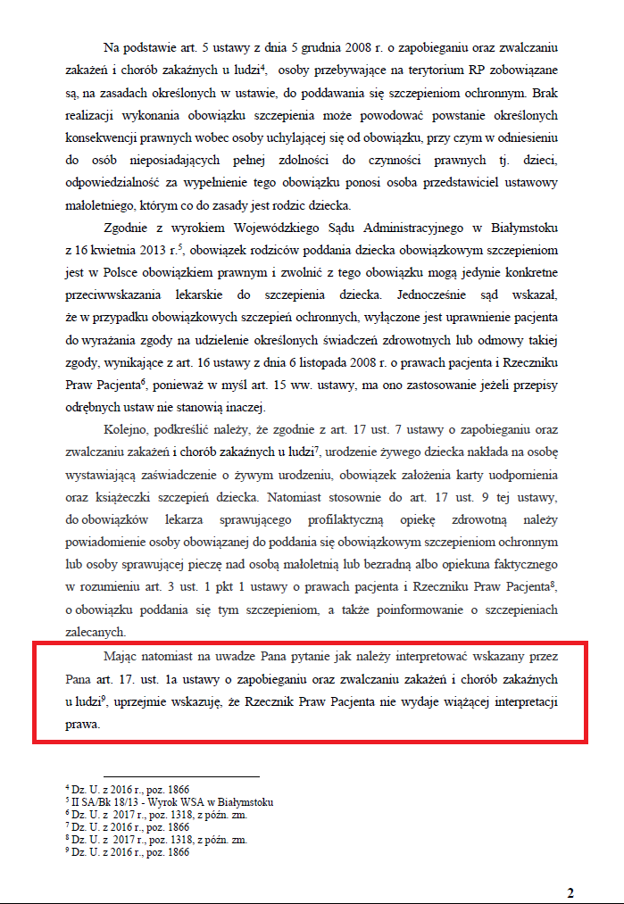 Niezwykle zabawne wydaje się również jedno z ostatnich zdań napisanych przez RPP: „Zauważyć jednak należy, że brak jest przepisu, który wyłączałby obowiązek poddania się obowiązkowym szczepieniom tylko ze względu na możliwe hipotetyczne powikłania”.
