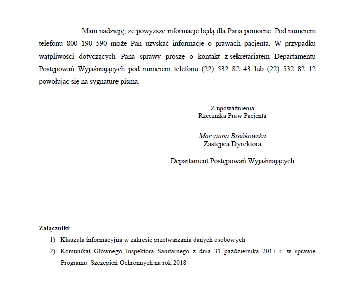 Jeśli Pan Rzecznik nie umie lub nie czuje się na siłach udzielić mi odpowiedzi na powyższe, to uprzejmie proszę chociaż o wskazanie urzędu lub organu, do którego mogę się z tymi pytaniami zwrócić i który mi na te pytania odpowie, wyjaśniając moje wątpliwości związane z prawami pacjenta przed zabiegiem medycznym szczepienia dziecka w ramach PSO.