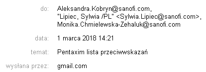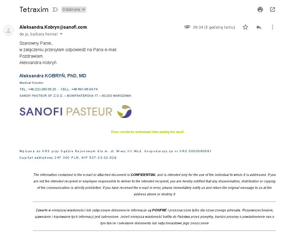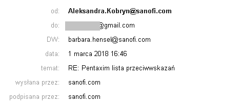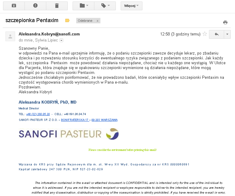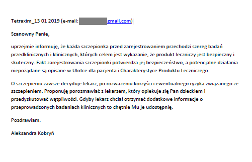 Jednocześnie informuję, iż mojej Mocodawczyni znana jest treść dokumentu „charakterystyka produktu leczniczego” dla konkretnej szczepionki.