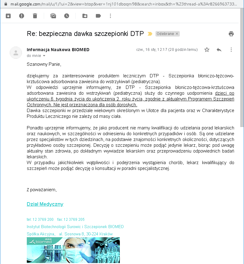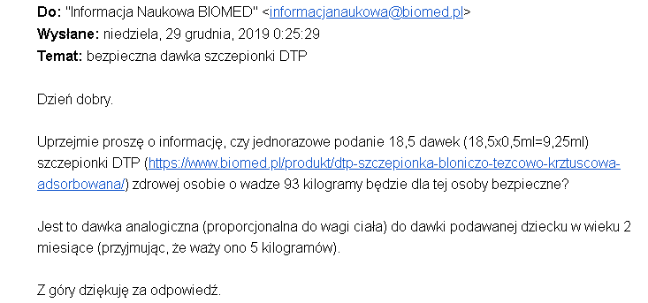 I ku mojemu zdziwieniu okazało się, że producent szczepionki jest wobec postawionego problemu zupełnie bezradny. Otóż Biomed zwyczajnie stchórzył.