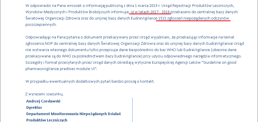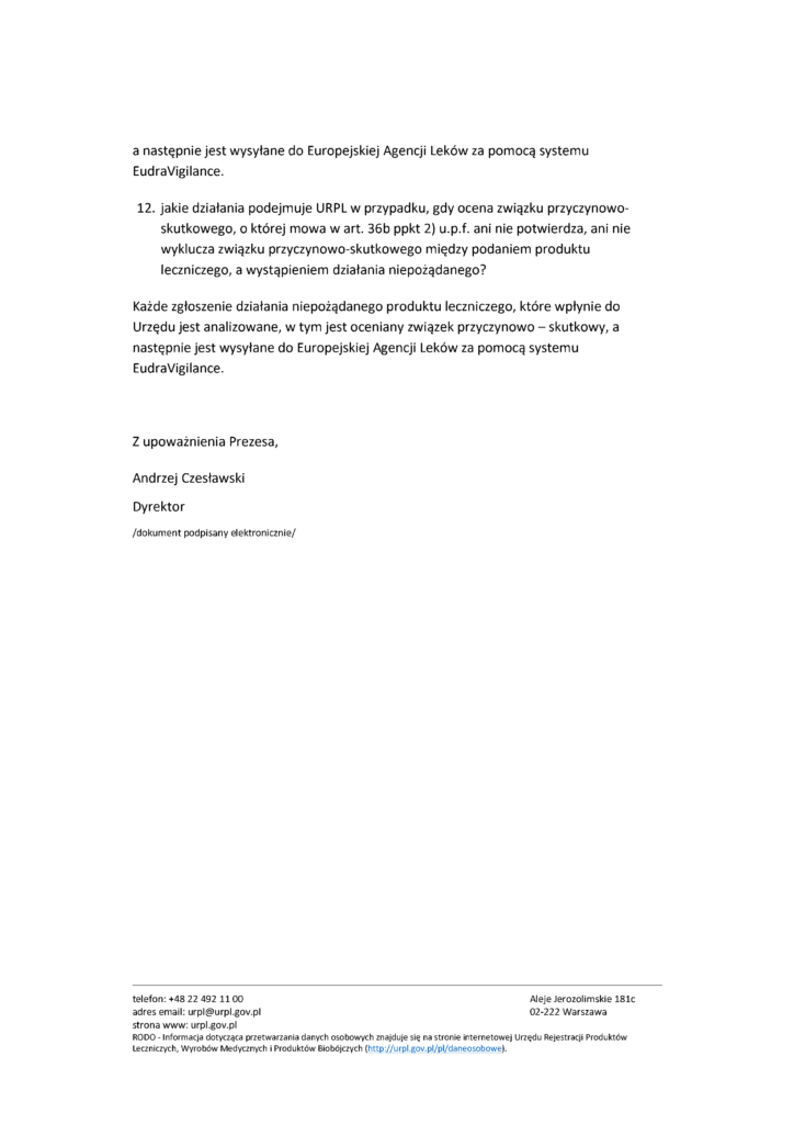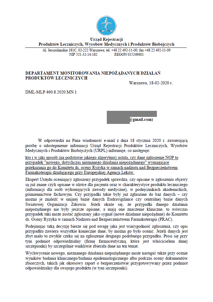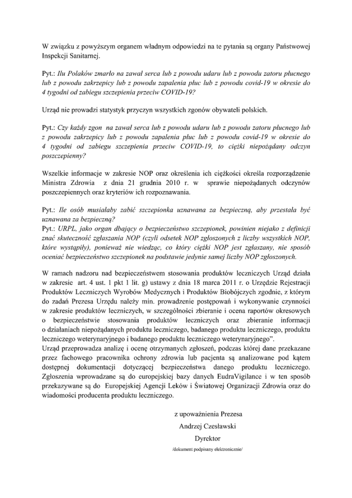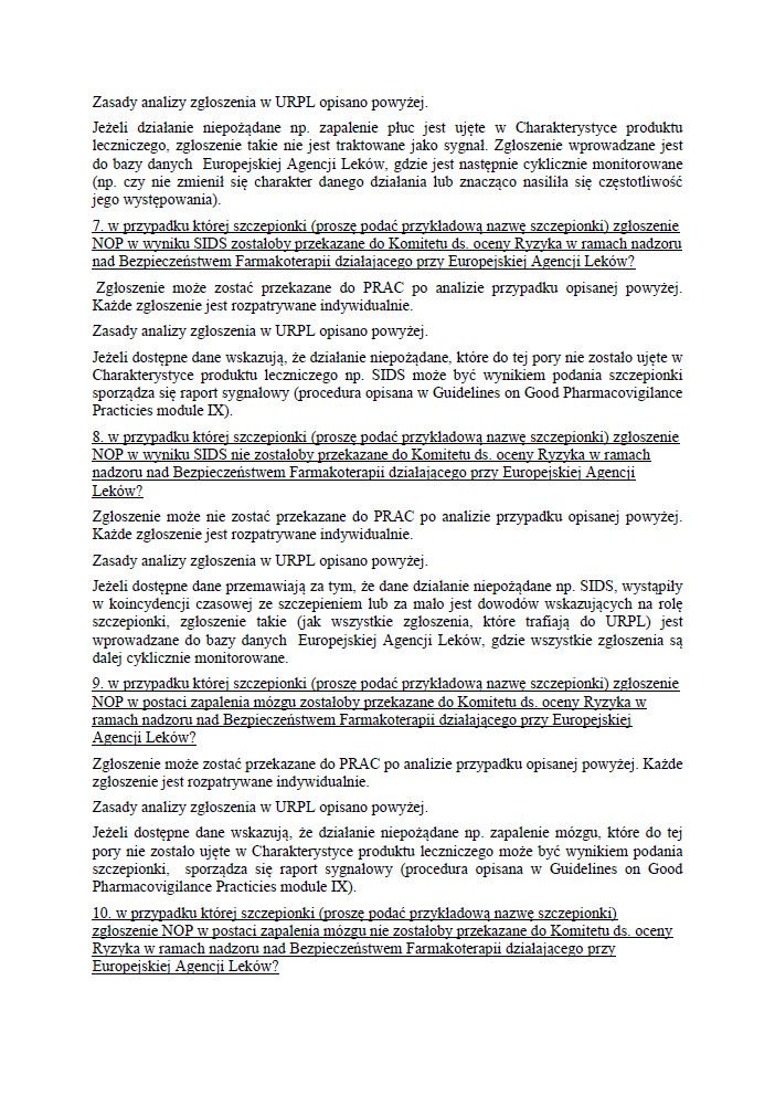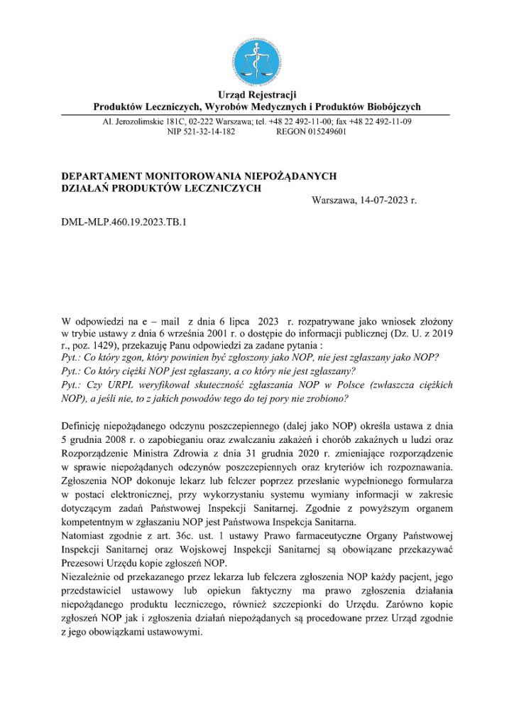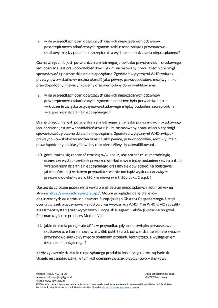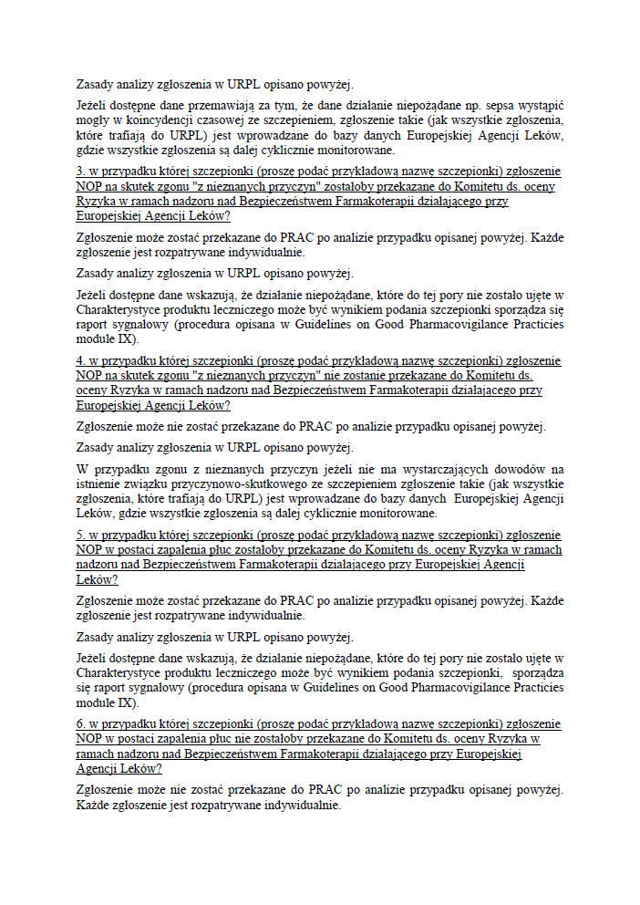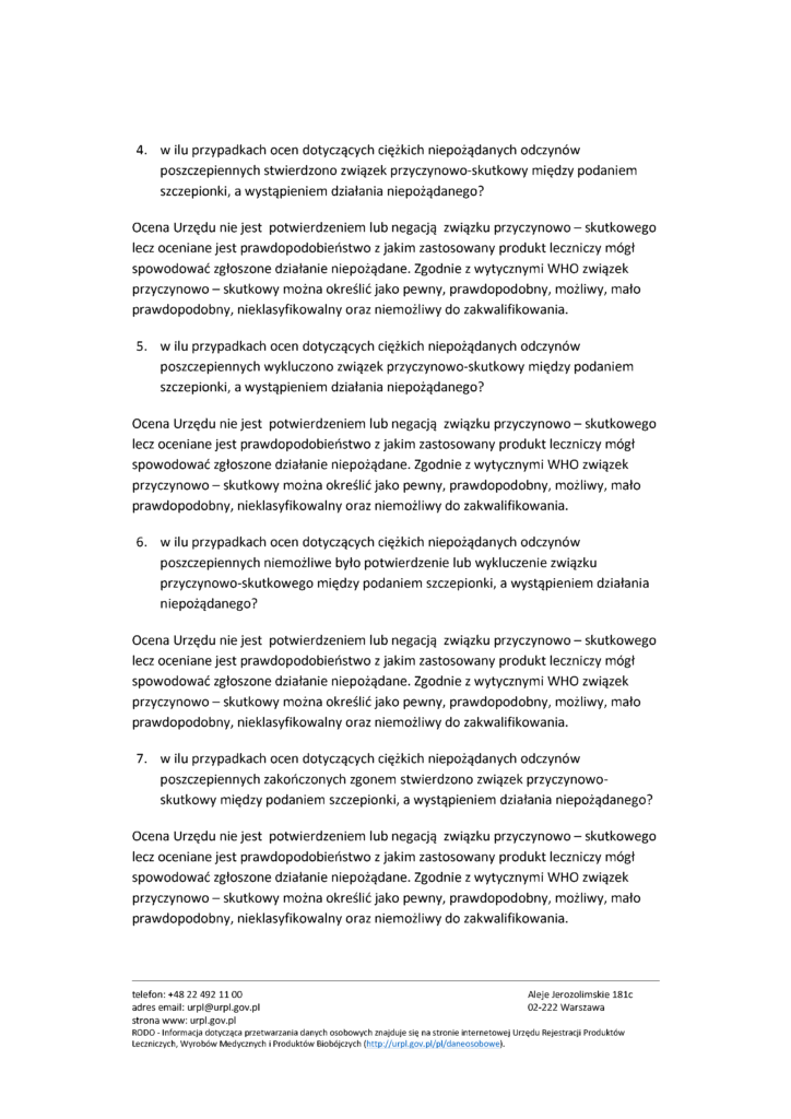W ilu przypadkach wszystkich dotychczas wykonanych przez URPL analiz związków przyczynowo-skutkowych, o których mowa w art. 36b. pkt 2. ustawy z dnia 6 września 2001 r. Prawo farmaceutyczne, ustalono pewny związek przyczynowo-skutkowy między zgonem, a podaniem szczepionki, oraz pewny związek przyczynowo-skutkowy między wystąpieniem ciężkiego NOP, a podaniem szczepionki?