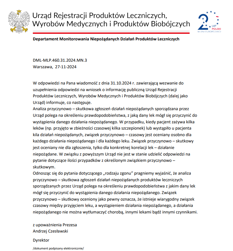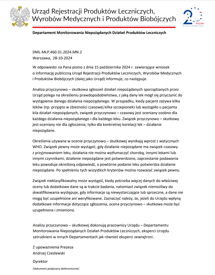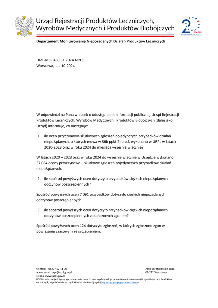 W ilu przypadkach przeprowadzonych przez URPL analiz związku przyczynowo-skutkowego między NOP, a podaniem szczepionki, dotyczących ciężkich NOP zakończonych zgonem, zgłoszonych w latach 2020-2023 oraz w roku 2024 do miesiąca września włącznie (124 przypadki ciężkich NOP zakończonych zgonem zgodnie z pismem DML-MLP.460.31.2024.MN.1), określono związek przyczynowo-skutkowy między NOP, a podaniem szczepionki jako: