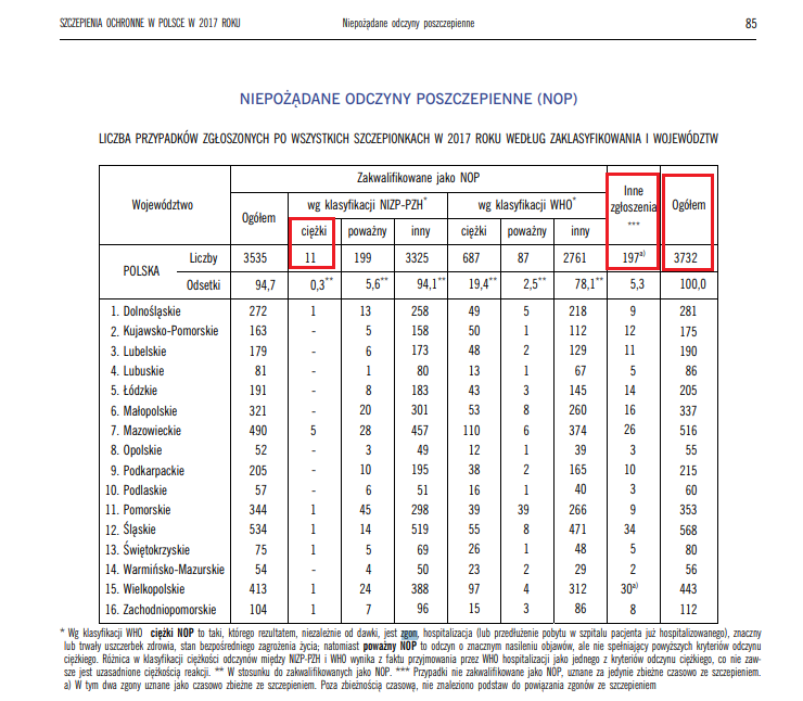Powyższe pytania zmierzają do ustalenia, czy Państwowy Zakład Higieny fałszuje statystyki NOP wyłącznie w odniesieniu do zgłoszeń ciężkich NOP zakończonych zgonem (wbrew obowiązującemu prawu uznając, że taki zgon nie jest ciężkim niepożądanym odczynem poszczepiennym, bo nie stwierdzono związku przyczynowego ze szczepieniem), czy też proceder bezprawnego oceniania, czy NOP to NOP poprzez nieuprawnione stosowanie kryterium przyczynowości ma miejsce również w przypadku innych zgłoszeń niepożądanych odczynów poszczepiennych – ze szczególnym uwzględnieniem zgłoszeń odczynów ciężkich.