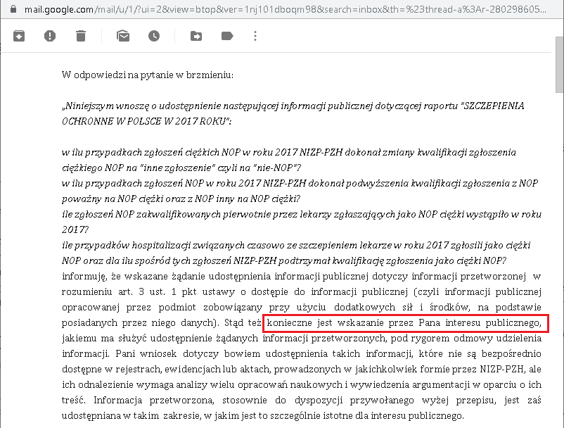 Stąd też mój wniosek jest jak najbardziej uzasadniony interesem publicznym, bo jego celem jest zwiększenie bezpieczeństwa obowiązkowych szczepień ochronnych. A uzyskanie odpowiedzi na pytania, które w przedmiotowym wniosku zadałem, jest w tym celu konieczne, ponieważ raporty roczne PZH dotyczące szczepień ochronnych nie zawierają informacji, o której udostępnienie wnioskuję, czyli nie zawierają informacji, ile zgłoszeń ciężkich NOP wystąpiło w danym roku oraz ile z nich PZH zakwalifikował do kategorii nie-NOP i na podstawie jakiego kryterium dokonano tej kwalifikacji.