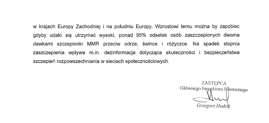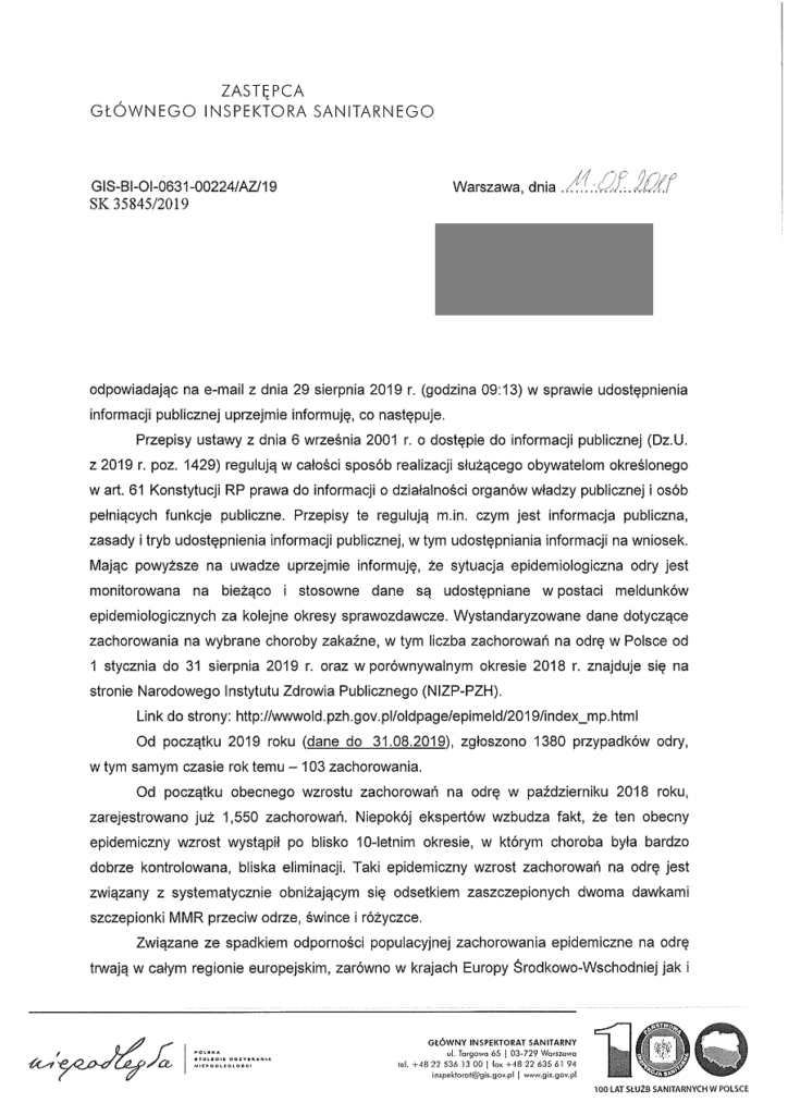 Skoro Główny Inspektor Sanitarny w piśmie GIS-BI-OI-0631-00224/AZ/2019 (SK 35845/2019) z dnia 11.09.2019 stawia tezę o spadającym odsetku osób zaszczepionych dwiema dawkami MMR jako przyczynie zwiększonej zachorowalności na odrę w tym roku, to oczekuję od Głównego Inspektora Sanitarnego uzasadnienia tej tezy danymi liczbowymi, które udowodnią ten rzekomy spadek liczby osób z dwiema dawkami MMR lub z dwiema dawkami szczepienia przeciw odrze.