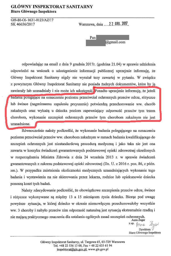 Treść wszystkich dokumentów będących w posiadaniu Głównego Inspektoratu Sanitarnego, które ze względów medycznych uzasadniają konieczność poddawania szczepieniu obowiązkowemu dziecka np. przeciw odrze, śwince lub różyczce nawet jeśli dziecko naturalnie przechorowało te choroby, a więc dzięki temu przechorowaniu zyskało naturalną odporność przeciw kolejnym zachorowaniom.