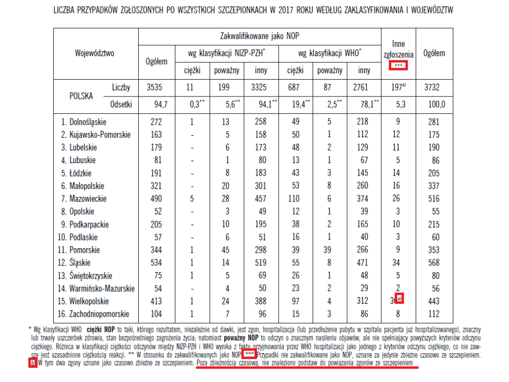 Niestety z raportów PZH w żaden sposób nie wynika, czy kategoria „Inne zgłoszenia” zawiera wszystkie przypadki „uznane za jedynie zbieżne czasowo ze szczepieniem” czy tylko niektóre. Nie wiadomo więc, czy każdy przypadek uznany przez PZH jako NOP został powiązany ze szczepieniem nie tylko czasowo, ale także przyczynowo.