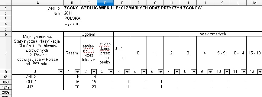 Dla przykładu, przesortowana tabela GUS ze zgonami w roku 2011 wygląda tak: