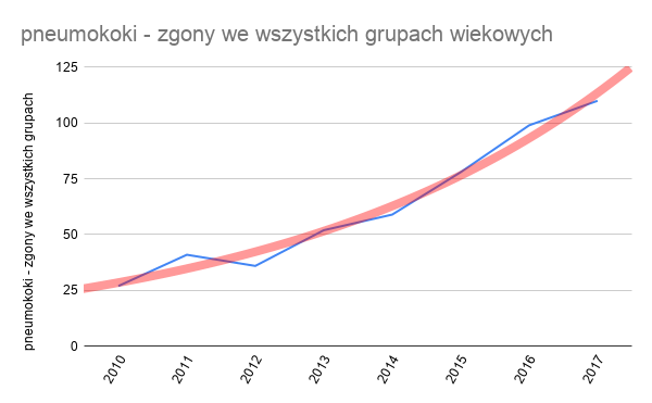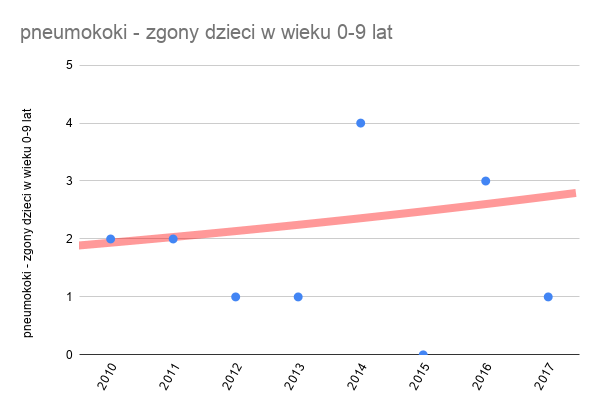 A jeśli weźmiemy pod uwagę wyłącznie dzieci w wieku 0-9 lat zabite przez pneumokoki, to wykres będzie wyglądał następująco: