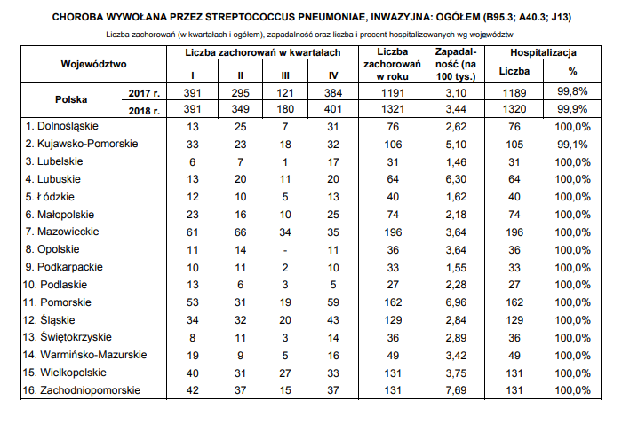 „Według najnowszych danych KOROUN-u, opublikowanych 25.04.2018 za 2017 rok najczęściej wykrywanym serotypem w populacji polskiej był serotyp 3 (obecny tylko w szczepionce PCV13), a u dzieci poniżej 5 roku życia drugim najczęstszym serotypem był serotyp 19A (obecny tylko w szczepionce PCV13). Serotypy 3 i 19A zajmowały dwa pierwsze miejsca jako serotypy odpowiedzialne za zgony w całej populacji (obecne tylko w szczepionce PCV13). Serotyp 19A jest najbardziej wielolekoopornym (MDR) serotypem (obecny tylko w szczepionce PCV13).”