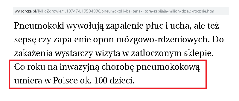 Swoją drogą, czy ktoś ma jakiś pomysł, skąd na przykład Wyborcza bierze dane, z których wynika, że rocznie pneumokoki zabijają około setki dzieci?