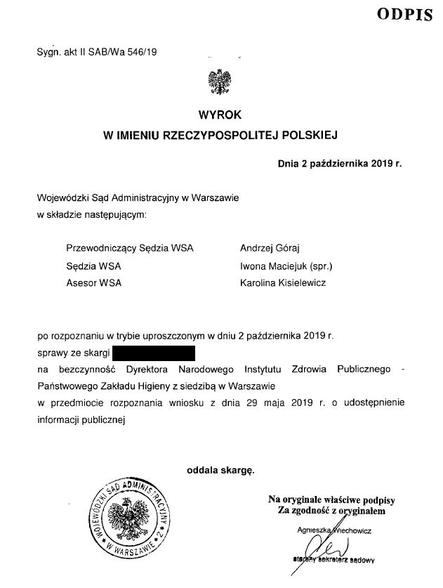bo Wojewódzki Sąd Administracyjny oddalił moją skargę na bezczynność PZH. 🙁