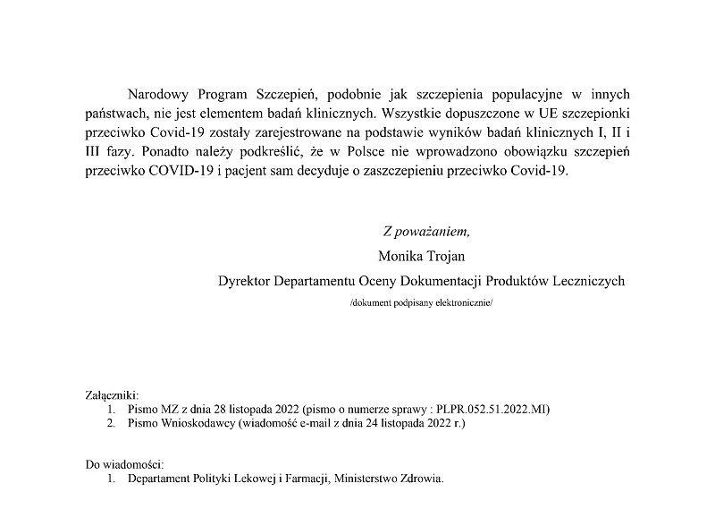 Pytanie skierowane do Ministerstwa Zdrowia dnia 24 listopada 2022: