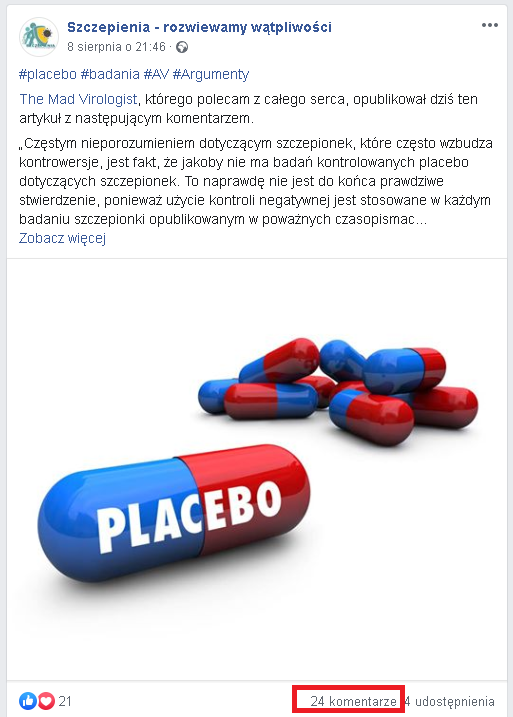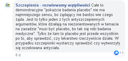 Oczywiście takich badań [na wszelki wypadek?] po prostu się nie wykonuje i dlatego profil „Szczepienia – rozwiewamy wątpliwości” robi wszystko, aby nie przyznać, że nikt nie bada bezpieczeństwa szczepionek w sposób najbardziej oczywisty z możliwych, czyli porównując działanie szczepionki do działania obojętnego placebo.