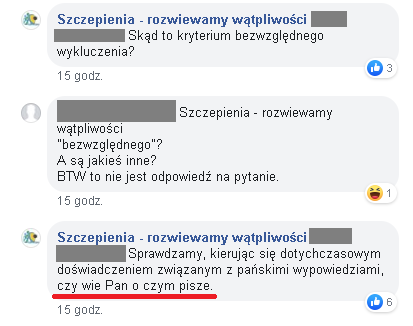 Czy osoby prowadzące profil „Szczepienia – rozwiewamy wątpliwości” zdają sobie sprawę z tego, że unikanie odpowiedzi poprzez blokowanie pytań lub sugerowanie, że pytający nie rozumie, o co pyta, utwierdza tylko osoby sceptyczne wobec szczepień, że ich sceptycyzm jest jak najbardziej uzasadniony?