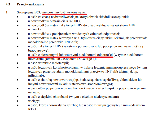 A teraz sprawdźmy, jak „Szczepienia – rozwiewamy wątpliwości” rozwiewa wątpliwości związane z wykluczeniem u noworodka wrodzonych niedoborów odporności przed szczepieniem BCG, ponieważ sam producent wyraźnie pisze, że nie wolno podać szczepionki BCG osobie z pierwotnymi lub wtórnymi niedoborami odporności (w tym z niedoborem