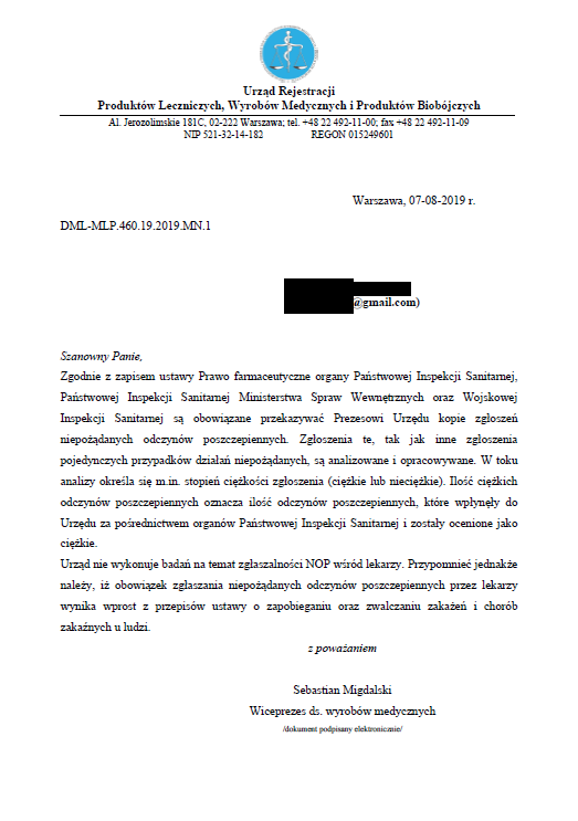 Czyż to nie jest trochę niepokojące, że wiceprezes urzędu od rejestracji leków i szczepionek posługuje się taką dziwną logiką, a rzecznik tego samego urzędu nie odróżnia liczby zgłoszonych NOP, od liczby wszystkich NOP?