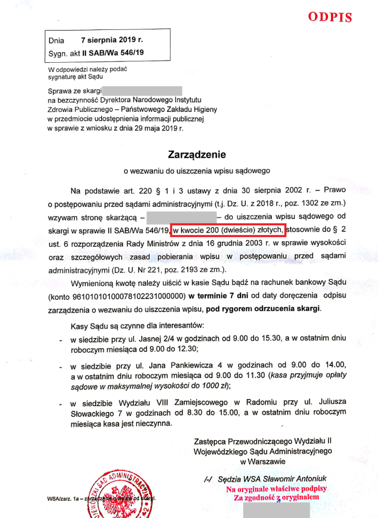 Wpłacam więc teraz do sądu te dwie „stówki” i niech sąd decyduje, czy PZH odpowiedzi udzielił, czy nie udzielił.
