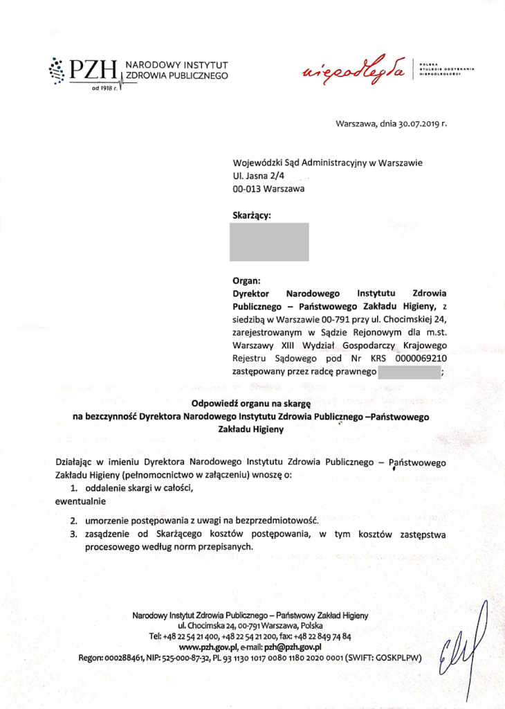 Jak być może niektórzy z Was pamiętają, niedawno złożyłem w Wojewódzkim Sądzie Administracyjnym skargę na Państwowy Zakład Higieny, który nie chciał mnie poinformować, ile zgłoszeń NOP w roku 2017 uznał za NOP potwierdzając związek przyczynowo-skutkowy ze szczepieniem. Chciałem w ten sposób sprawdzić, czy oni za nie-NOP uznają tylko zgłoszenia NOP zakończonych zgonem, czy może też jakieś inne.